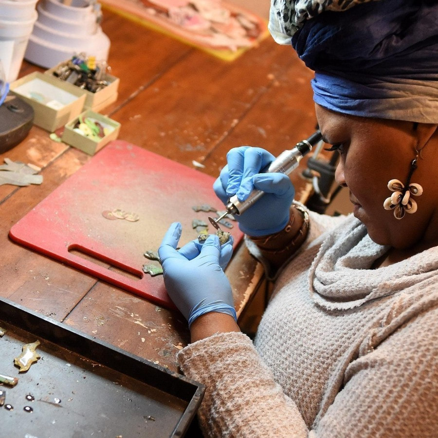 Rebel Nell partners with local organizations to seek out women who have struggled to find and retain employment in Detroit, hires them as creative designers, teaches them to craft wearable art from fallen layers of graffiti, educates them on financial management, life wellness, and entrepreneurship, and supports their transition to a life of independence. The graffiti comes from locations across Detroit, Flint, and Chicago where street artists tell their stories. Over time, layers of graffiti begin to peel away and fall from the walls. Rebel Nell collects this fallen paint and gives it new life in their unique rings, earrings, necklaces, bracelets, watches, cuff links, and tie clips. Each piece is one of a kind. Rebel Nell donates a portion of sales to their nonprofit arm T.E.A (Teach, Empower, Achieve) to help sustain the programming for employees. They provide flexible work schedules, a living wage, micro-loan assistance, legal aid, housing assistance, yoga and wellness classes, team building experiences, and other support services and programs.