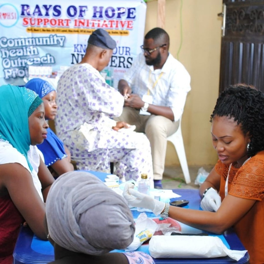 Rays of Hope Support Initiative (ROHSI) organizes community health awareness and outreach programs to combat non-communicable diseases (NCDs) in underserved communities in Ibadan, Nigeria. They support individuals with hypertension and diabetes through health education, screenings, referral services, lifestyle support, and policy advocacy. ROHSI brings free health services to marginalized groups who would not otherwise have access due to their geographic location, economic status, language, literacy, or other social factors. They are a not-for-profit organization and reinvest all surplus towards their mission.