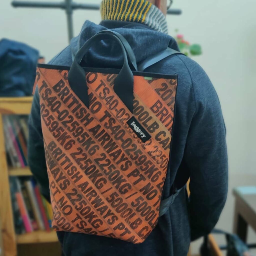 Jaggery creates livelihood opportunities for people from disadvantaged communities and transforms industrial waste from northern India into bags, cases, and other functional everyday gear. They source, clean, and repurpose old seat belts, cargo lashing straps, decommissioned military canvas and parachutes, tarpaulins, inflatable bouncy castles, textile offcuts, and other waste materials and use high quality new hardware fittings to ensure durability. Products are designed to use materials as efficiently as possible and minimize waste. Jaggery employs staff from communities that have been discriminated against, what the Indian government calls Other Backward Classes and Economically Disadvanted Sections. They provide fair trade wages, English classes, and training in basic computing skills. Jaggery uses their platforms to raise awareness about waste, fair trade, and the transition to a circular economy. They partner with Trees for the Future to plant a tree for every purchase.