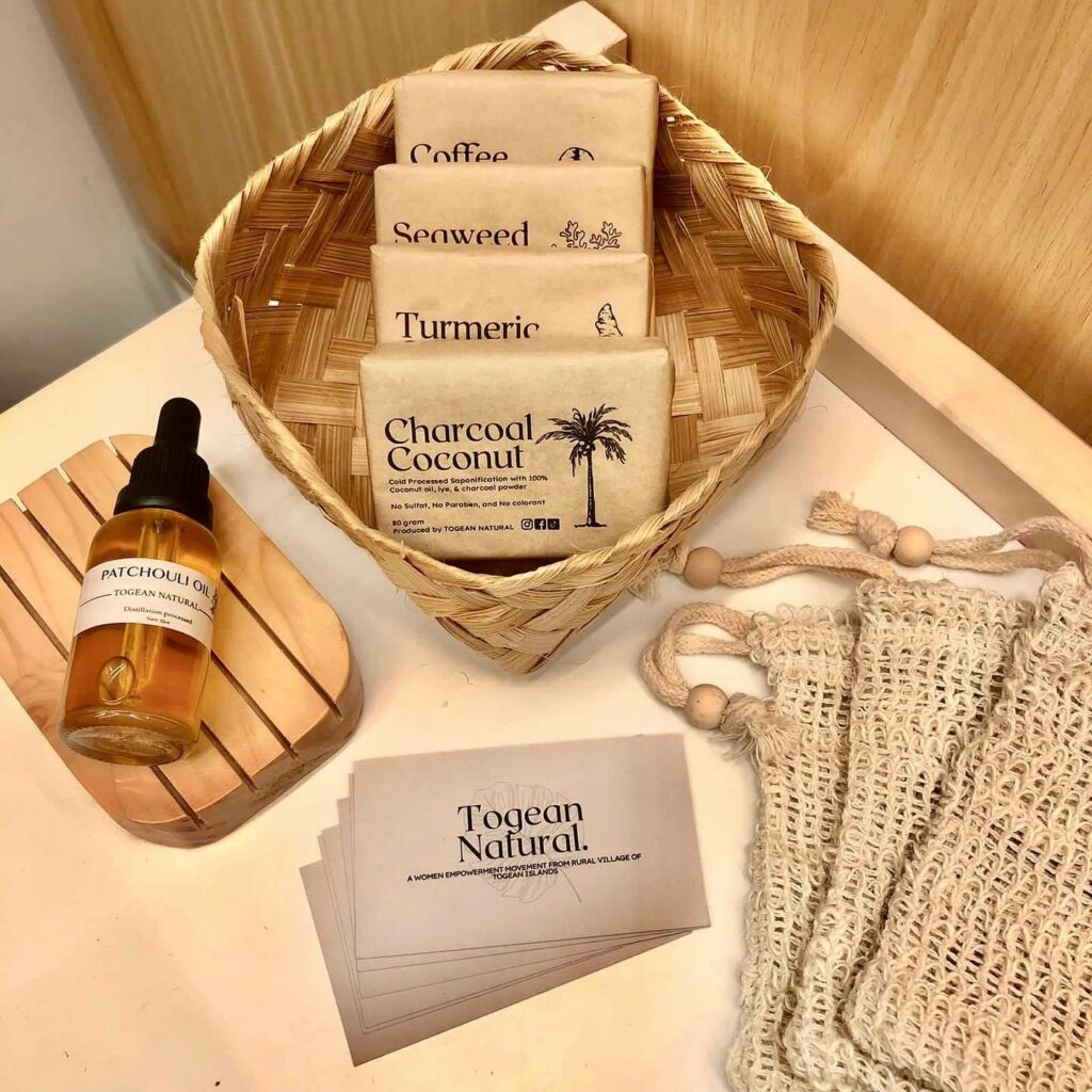 Togean Natural works with women in remote villages of the Togean Islands in Sulawesi to produce natural soap, patchouli oil, and coconut oil using local ingredients, filtered rainwater, and solar energy. The oils are made by hand in Tumbulawa village and the soaps are made using cold process saponification by women in Siatu, a floating village of ethnic Bajau. They source coconut, patchouli, seaweed, coffee, turmeric, cloves, and other materials directly from local producers. Togean Natural provides natural soap for free in the participating villages and is committed to selling at affordable prices to protect the ocean and reduce the damage caused by synthetic petrochemical soaps. They operate out of Togo Eang Eco Lodge, participate in coral planting, and mangrove planting, and are part of the Togean Conservation Foundation and the Global Ecovillage Network Oceania and Asia.
