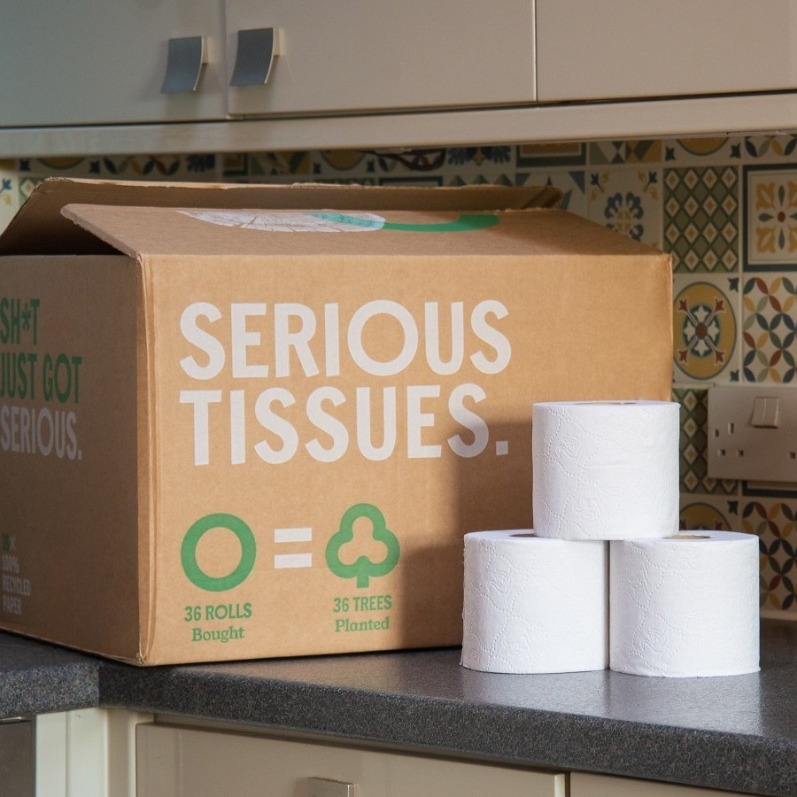 Serious Tissues is toilet paper that plants trees instead of cutting them down. Their toilet rolls are made in the United Kingdom from 100 percent recycled paper with no individual wrapping, no plastic, and no dyes, perfumes, or other unnecessary additives. Serious Tissues offers online subscription services, supplies restaurants, pubs, hotels, offices, and other wholesale customers, and plants a tree for every toilet roll sold. Tree planting is done through partner organizations that use native species and provide employment to people in need. Serious Tissues calculates their full business carbon footprint and offsets emissions according to international standards. Their tree planting program is in addition to their carbon neutrality and does not factor into the calculation. Serious Tissues is a member of The Conduit and Social Enterprise UK and is certified Plastic Negative by rePurpose Global.