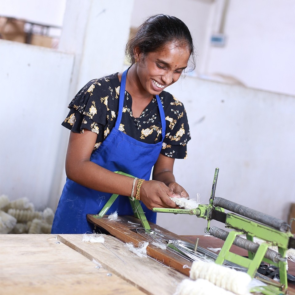 Satya Special School empowers children and youth with special needs and works towards inclusion through education, employment, and advocacy. They started in 2003 as a daycare center for 20 children and have now expanded to a large network of urban and rural centers throughout Puducherry. Initiatives include a high-risk newborn clinic, an early intervention center, inclusive education programs and therapy centers, mobile therapy units, a research center, a training academy, and more. Satya also offers sustainable livelihood programs for young people and adults with special needs and their family members. Under their Thirankoodu brand, they work with mothers of children with disabilities to create upcycled fabric waste mats, palm leaf containers, recycled paper bags, coconut shell crafts, embroidered housewares and accessories, and other handmade products for the local community.