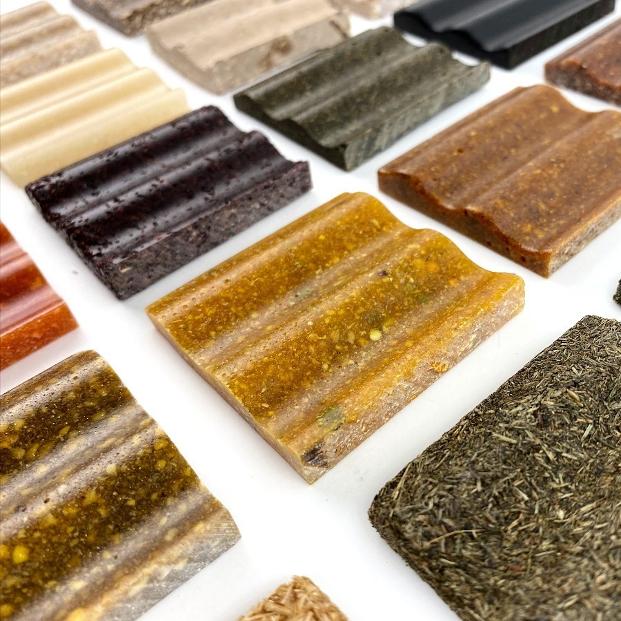 Ottan Studio develops circular materials to be used in sustainable interior design and industrial design projects. They collect agricultural, landscaping, and food waste from local producers, greenhouses, municipalities, and retailers, clean, dry, grind, and mix them with environmentally responsible resins, and inject them into molds to create sustainable biocomposites with the colors and textures of nature. Ottan materials can be used to produce decorative and structural panels, furniture, lighting, and other housewares without cutting a tree, quarrying stone and marble, or adding petrochemical colors. They reduce energy consumption and waste, prevent raw material extraction, and protect natural ecosystems.