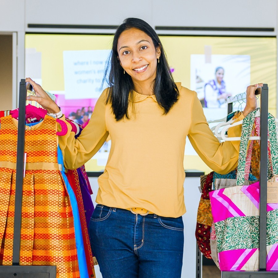 Pri Pri contributes to a circular economy by using vintage saris to create sustainable children’s clothing and upcycled accessories. They collect preloved saris through personal contacts and secondhand markets, transform them into unique dresses and tops, and partner with Animedh Charitable Trust (ACT) to support marginalized women and ensure every scrap of the rescued material is used. Women in the (ACT) tailoring internship program use the fabric offcuts to produce colorful bags, wreaths, bunting, ornaments, gift wrap, and scrunchies. Pri Pri is part of Go Inspire, a network for sustainability and women-led businesses in Wimbledon.